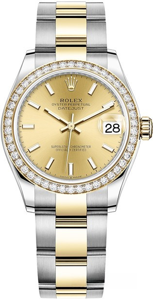 Водостойкие часы Rolex Datejust Datejust 31mm Steel and Yellow Gold выпущены в круглом корпусе из желтого золота 18к и нержавеющей стали. Размер составляет 31 мм, водонепроницаемость 100 м. Внутри корпуса установлен автоматический механизм. На золотистом циферблате отображаются часы, минуты, секунды, дата. Часы комплектуются браслетом из желтого золота 18к и нержавеющей стали. Безель из белых бриллиантов.