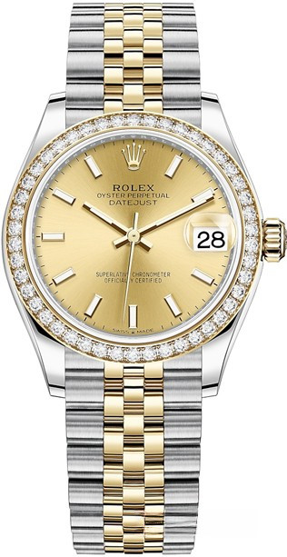 Водостойкие часы Rolex Datejust Datejust 31mm Steel and Yellow Gold выпущены в круглом корпусе из желтого золота 18к и нержавеющей стали. Размер составляет 31 мм, водонепроницаемость 100 м. Внутри корпуса установлен автоматический механизм. На золотистом циферблате отображаются часы, минуты, секунды, дата. Часы комплектуются браслетом из желтого золота 18к и нержавеющей стали. Безель из белых бриллиантов.