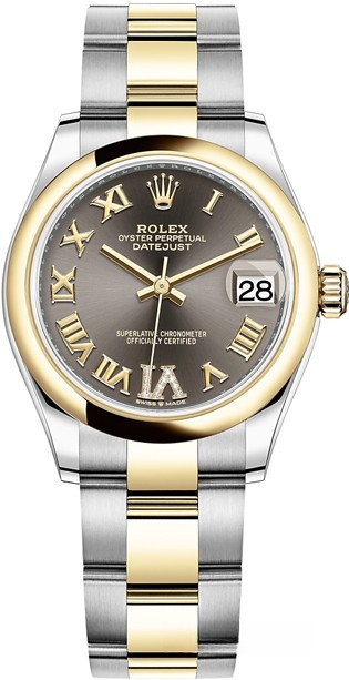 Водостойкие часы Rolex Datejust Datejust 31mm Steel and Yellow Gold выпущены в круглом корпусе из желтого золота 18к и нержавеющей стали. Размер составляет 31 мм, водонепроницаемость 100 м. Внутри корпуса установлен автоматический механизм. На сером циферблате с белыми бриллиантами отображаются часы, минуты, секунды, дата. Часы комплектуются браслетом из желтого золота 18к и нержавеющей стали.