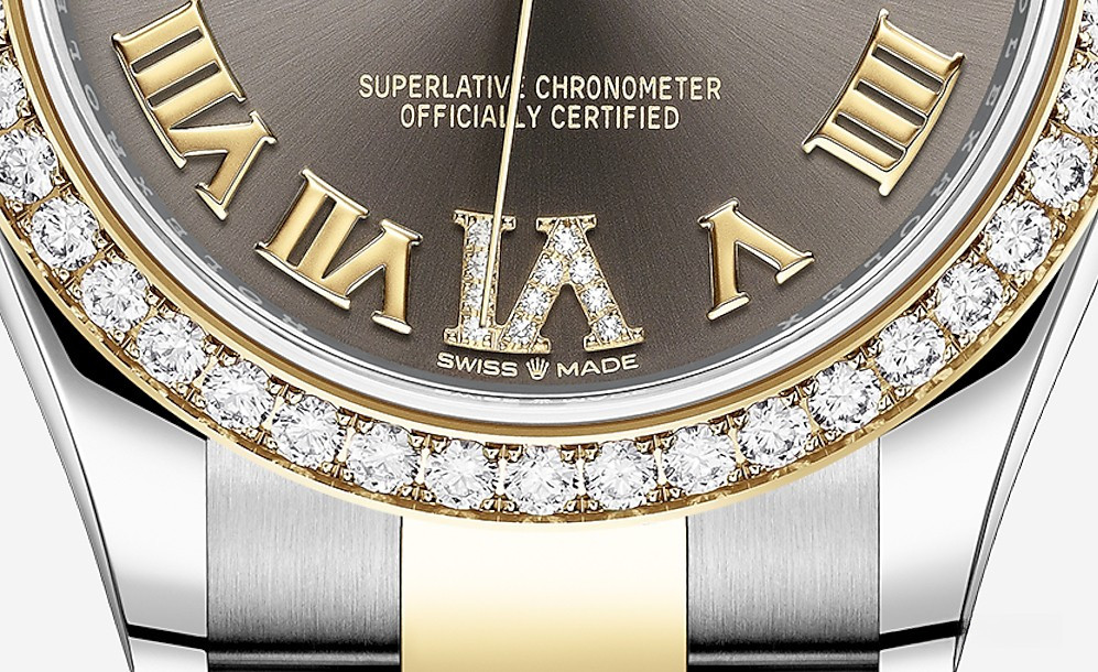 Водостойкие часы Rolex Datejust Datejust 31mm Steel and Yellow Gold выпущены в круглом корпусе из желтого золота 18к и нержавеющей стали. Размер составляет 31 мм, водонепроницаемость 100 м. Внутри корпуса установлен автоматический механизм. На сером циферблате с белыми бриллиантами отображаются часы, минуты, секунды, дата. Часы комплектуются браслетом из желтого золота 18к и нержавеющей стали. Безель из белых бриллиантов.