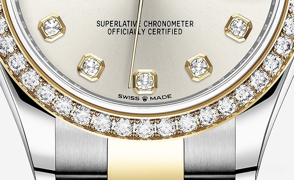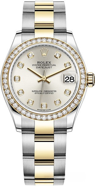 Водостойкие часы Rolex Datejust Datejust 31mm Steel and Yellow Gold выпущены в круглом корпусе из желтого золота 18к и нержавеющей стали. Размер составляет 31 мм, водонепроницаемость 100 м. Внутри корпуса установлен автоматический механизм. На серебристом циферблате с 10-ю белыми бриллиантами отображаются часы, минуты, секунды, дата. Часы комплектуются браслетом из желтого золота 18к и нержавеющей стали. Безель из белых бриллиантов.