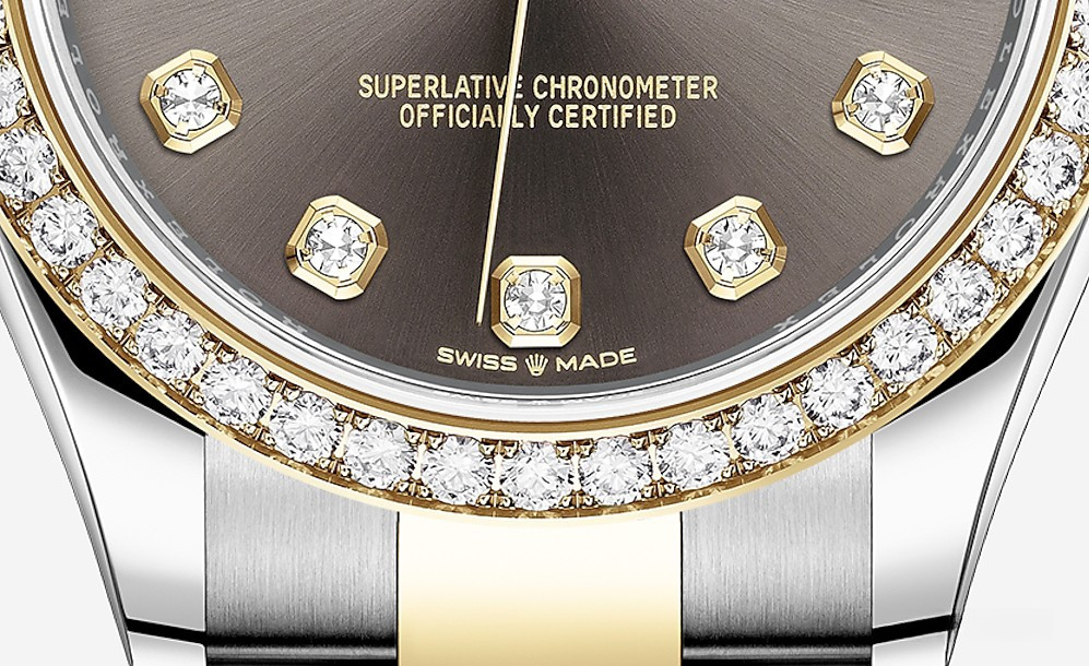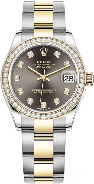 Водостойкие часы Rolex Datejust Datejust 31mm Steel and Yellow Gold выпущены в круглом корпусе из желтого золота 18к и нержавеющей стали. Размер составляет 31 мм, водонепроницаемость 100 м. Внутри корпуса установлен автоматический механизм. На сером циферблате с 10-ю белыми бриллиантами отображаются часы, минуты, секунды, дата. Часы комплектуются браслетом из желтого золота 18к и нержавеющей стали. Безель из белых бриллиантов.