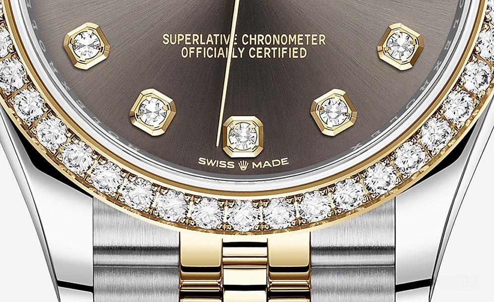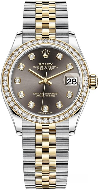 Водостойкие часы Rolex Datejust Datejust 31mm Steel and Yellow Gold выпущены в круглом корпусе из желтого золота 18к и нержавеющей стали. Размер составляет 31 мм, водонепроницаемость 100 м. Внутри корпуса установлен автоматический механизм. На сером циферблате с 10-ю белыми бриллиантами отображаются часы, минуты, секунды, дата. Часы комплектуются браслетом из желтого золота 18к и нержавеющей стали. Безель из белых бриллиантов.