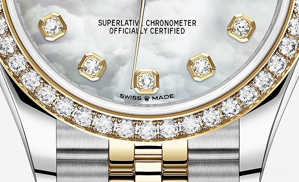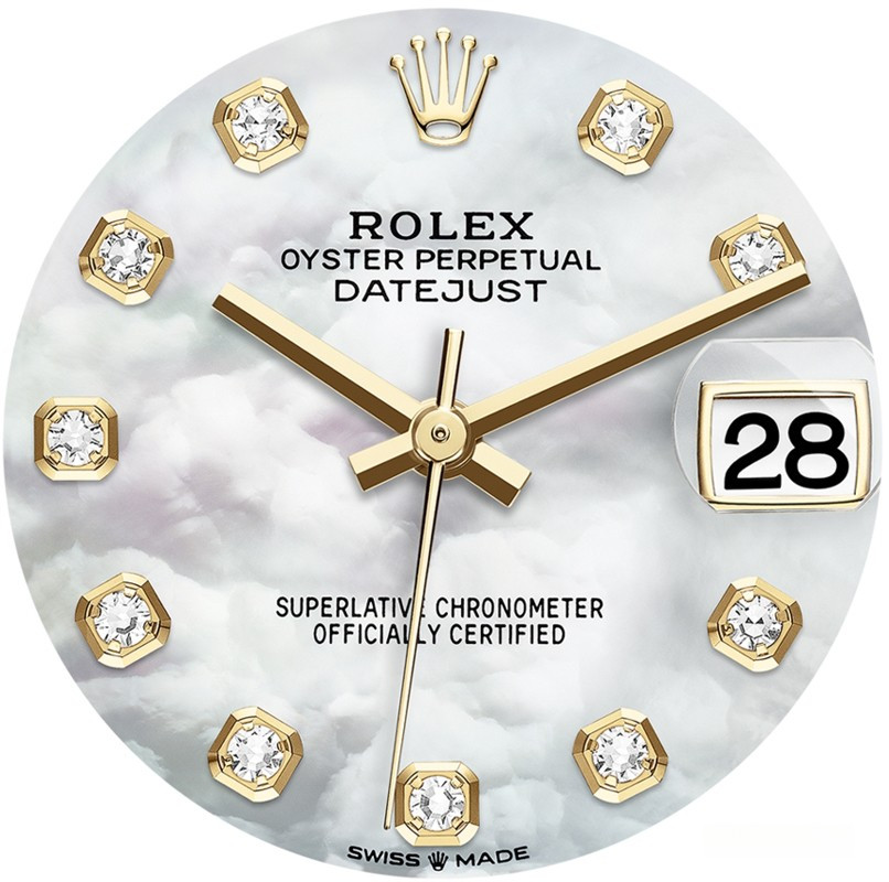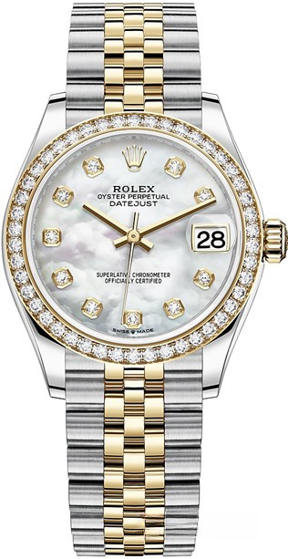 Водостойкие часы Rolex Datejust Datejust 31mm Steel and Yellow Gold выпущены в круглом корпусе из желтого золота 18к и нержавеющей стали. Размер составляет 31 мм, водонепроницаемость 100 м. Внутри корпуса установлен автоматический механизм. На белом жемчужном циферблате с 10-ю белыми бриллиантами отображаются часы, минуты, секунды, дата. Часы комплектуются браслетом из желтого золота 18к и нержавеющей стали. Безель из белых бриллиантов.