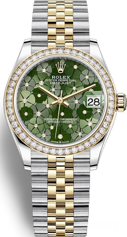 Водостойкие часы Rolex Datejust Datejust 31mm Steel and Yellow Gold выпущены в круглом корпусе из желтого золота 18к и нержавеющей стали. Размер составляет 31 мм, водонепроницаемость 100 м. Внутри корпуса установлен автоматический механизм. На зеленом циферблате с белыми бриллиантами отображаются часы, минуты, секунды, дата. Часы комплектуются браслетом из желтого золота 18к и нержавеющей стали. Безель из белых бриллиантов.