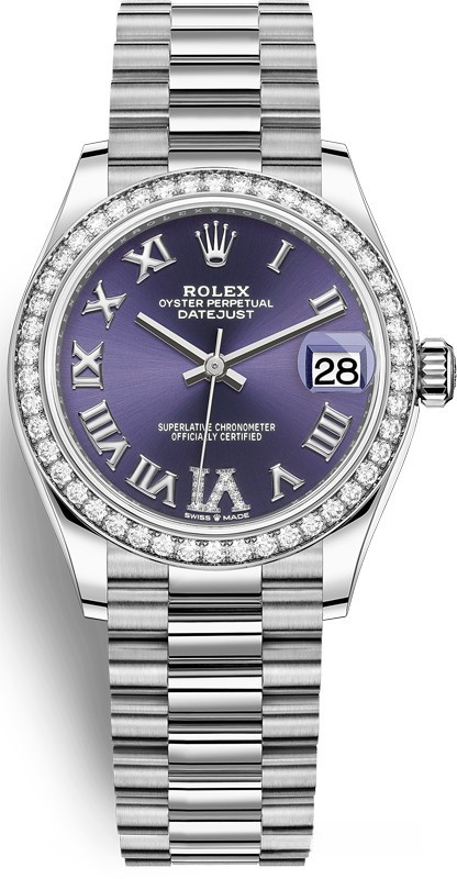 Водостойкие часы Rolex Datejust Datejust 31mm White Gold являются официально сертифицированным хронометром COSC, выпущены в круглом корпусе из белого золота 18к. Размер составляет 31 мм, водонепроницаемость 100 м. Внутри корпуса установлен автоматический механизм, Калибр 2236, обладающий запасом хода 55 часов. На синем циферблате с белыми бриллиантами отображаются часы, минуты, секунды, дата. Часы комплектуются браслетом из белого золота 18к с откидной застежкой. Безель из белых бриллиантов.