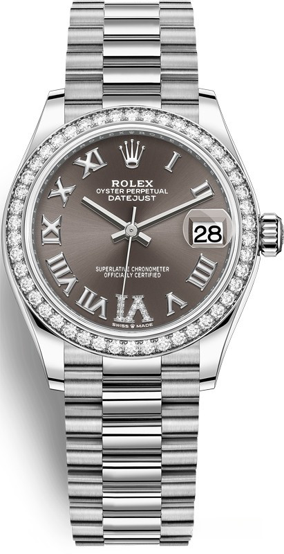 Водостойкие часы Rolex Datejust Datejust 31mm White Gold являются официально сертифицированным хронометром COSC, выпущены в круглом корпусе из белого золота 18к. Размер составляет 31 мм, водонепроницаемость 100 м. Внутри корпуса установлен автоматический механизм, Калибр 2236, обладающий запасом хода 55 часов. На сером циферблате с белыми бриллиантами отображаются часы, минуты, секунды, дата. Часы комплектуются браслетом из белого золота 18к с откидной застежкой. Безель из белых бриллиантов.