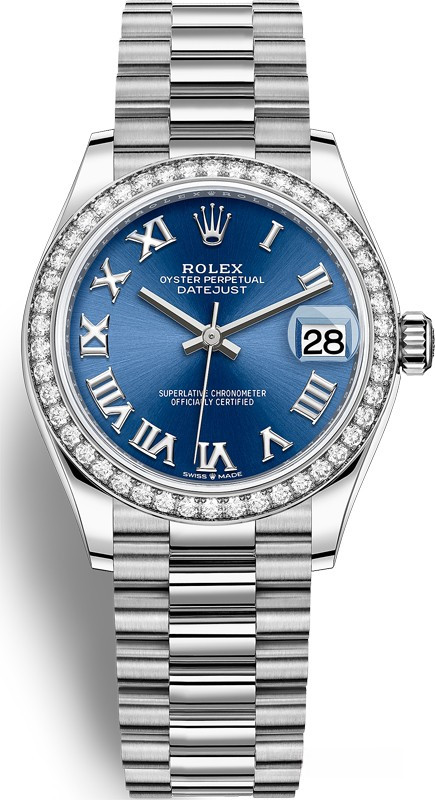Водостойкие часы Rolex Datejust Datejust 31mm Steel and White Gold выпущены в круглом корпусе из белого золота. Размер составляет 31 мм, водонепроницаемость 100 м. Внутри корпуса установлен автоматический механизм, Калибр Rolex 2236, обладающий запасом хода 55 часов. На синем циферблате отображаются часы, минуты, секунды, дата. Часы комплектуются браслетом из белого золота 18к. Безель из белых бриллиантов.