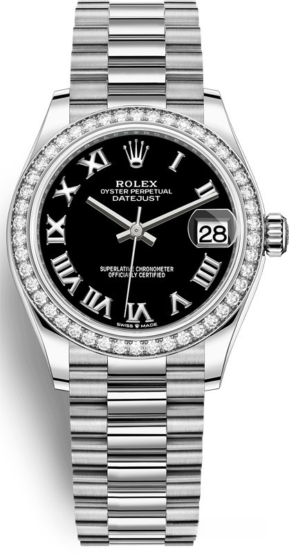 Водостойкие часы Rolex Datejust Datejust 31mm White Gold являются официально сертифицированным хронометром COSC, выпущены в круглом корпусе из белого золота 18к. Размер составляет 31 мм, водонепроницаемость 100 м. Внутри корпуса установлен автоматический механизм, Калибр 2236, обладающий запасом хода 55 часов. На черном циферблате отображаются часы, минуты, секунды, дата. Часы комплектуются браслетом из белого золота 18к с откидной застежкой. Безель из белых бриллиантов.