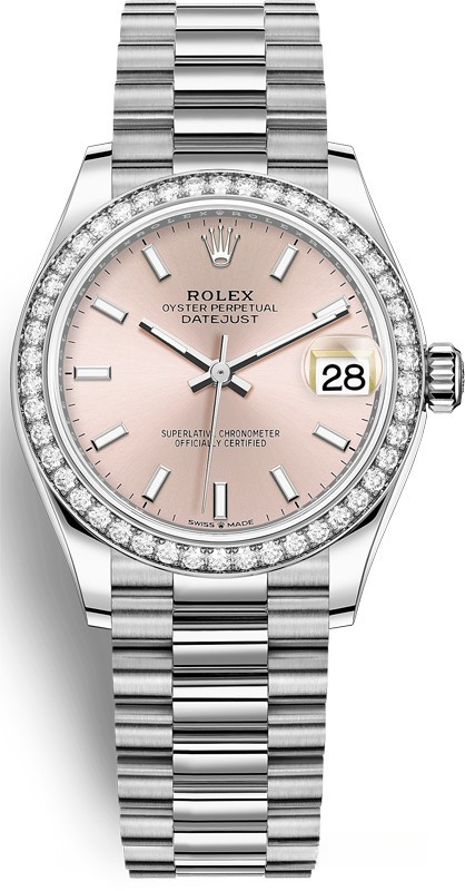 Водостойкие часы Rolex Datejust Datejust 31mm White Gold являются официально сертифицированным хронометром COSC, выпущены в круглом корпусе из белого золота 18к. Размер составляет 31 мм, водонепроницаемость 100 м. Внутри корпуса установлен автоматический механизм, Калибр 2236, обладающий запасом хода 55 часов. На розовом циферблате отображаются часы, минуты, секунды, дата. Часы комплектуются браслетом из белого золота 18к с откидной застежкой. Безель из белых бриллиантов.