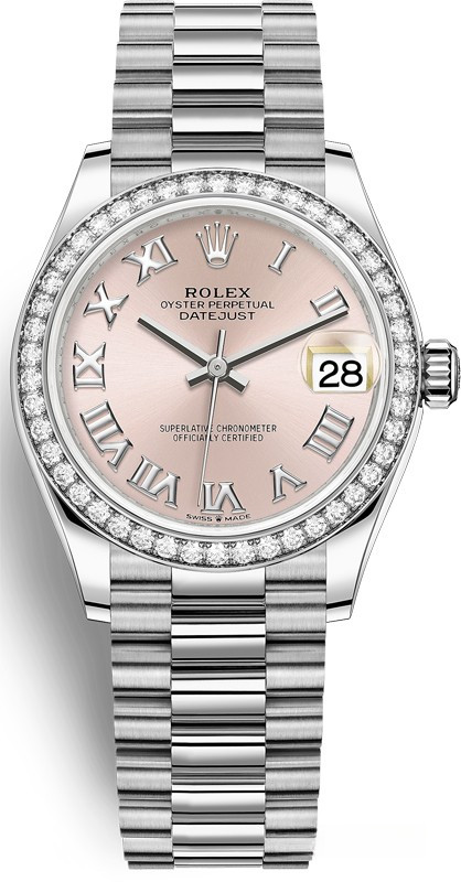 Водостойкие часы Rolex Datejust Datejust 31mm White Gold являются официально сертифицированным хронометром COSC, выпущены в круглом корпусе из белого золота 18к. Размер составляет 31 мм, водонепроницаемость 100 м. Внутри корпуса установлен автоматический механизм, Калибр 2236, обладающий запасом хода 55 часов. На розовом циферблате отображаются часы, минуты, секунды, дата. Часы комплектуются браслетом из белого золота 18к с откидной застежкой. Безель из белых бриллиантов.
