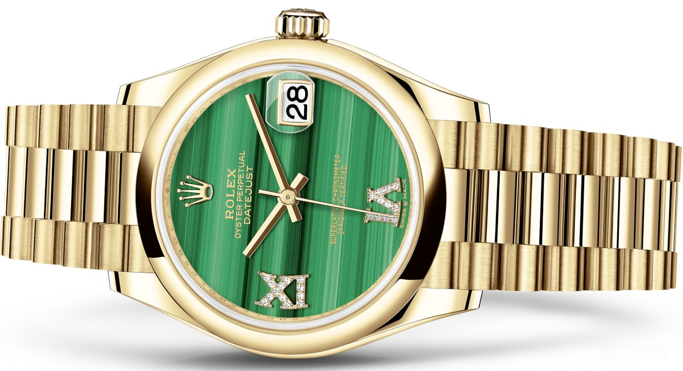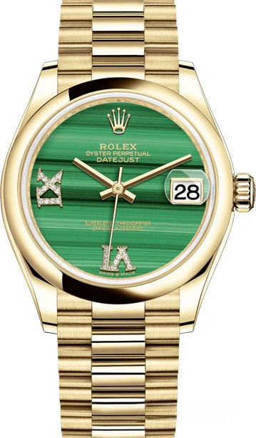 Часы Rolex Datejust Datejust 31mm Yellow Gold 278248-0004 выпущены в круглом корпусе из желтого золота 18к. Размер составляет 31 мм, водонепроницаемость 100 м. Внутри корпуса установлен автоматический механизм. На циферблате из зеленого малахита с белыми бриллиантами отображаются часы, минуты, секунды, дата. Часы комплектуются браслетом из желтого золота 18к.