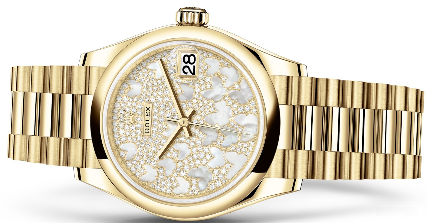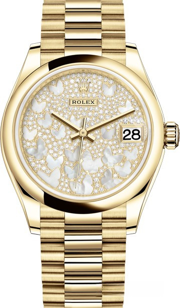 Часы Rolex Datejust Datejust 31mm Yellow Gold 278248-0022 выпущены в круглом корпусе из желтого золота 18к. Размер составляет 31 мм, водонепроницаемость 100 м. Внутри корпуса установлен автоматический механизм. На золотистом с белым жемчужным и белыми бриллиантами циферблате отображаются часы, минуты, секунды, дата. Часы комплектуются браслетом из желтого золота 18к.