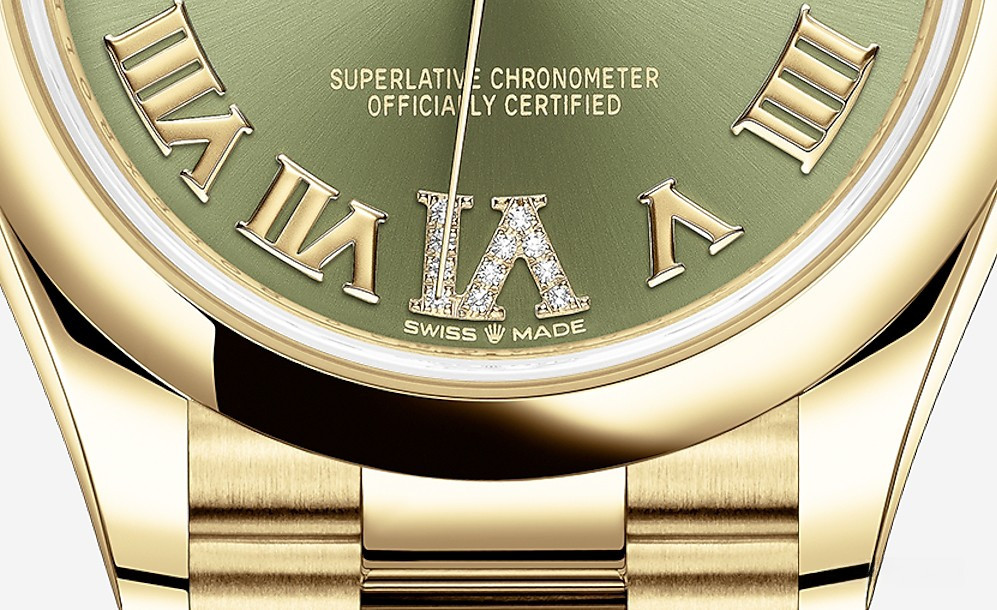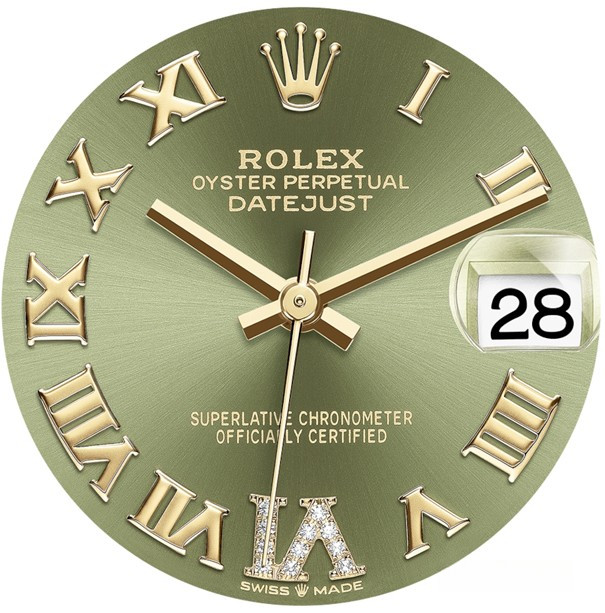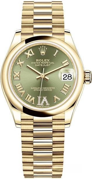 Часы Rolex Datejust Datejust 31mm Yellow Gold выпущены в круглом корпусе из желтого золота 18к. Размер составляет 31 мм, водонепроницаемость 100 м. Внутри корпуса установлен автоматический механизм. На зеленом циферблате с белыми бриллиантами отображаются часы, минуты, секунды, дата. Часы комплектуются браслетом из желтого золота 18к.