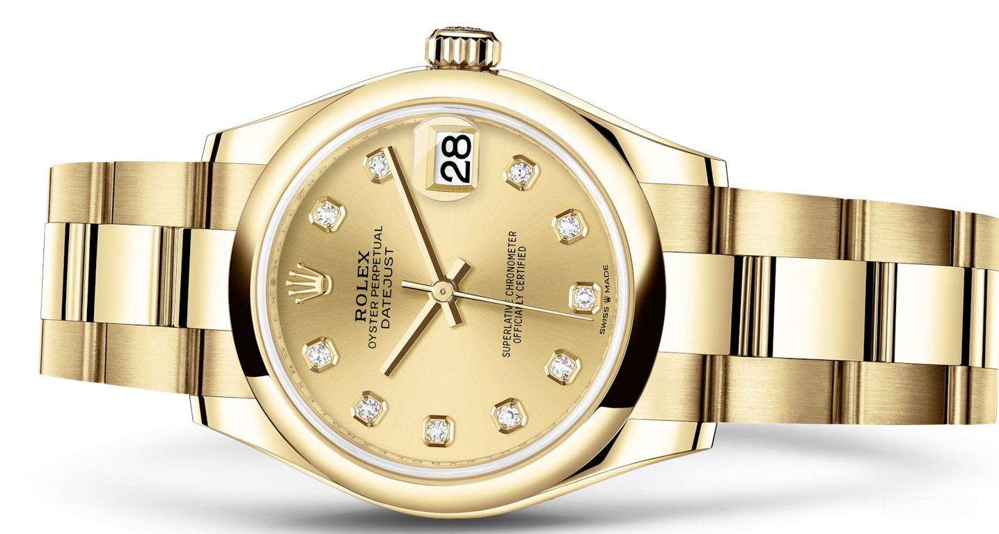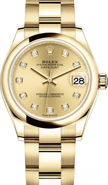 Часы Rolex Datejust Datejust 31mm Yellow Gold 278248-0013 выпущены в круглом корпусе из желтого золота 18к. Размер составляет 31 мм, водонепроницаемость 100 м. Внутри корпуса установлен автоматический механизм. На золотистом циферблате с 10-ю белыми бриллиантами отображаются часы, минуты, секунды, дата. Часы комплектуются браслетом из желтого золота 18к.