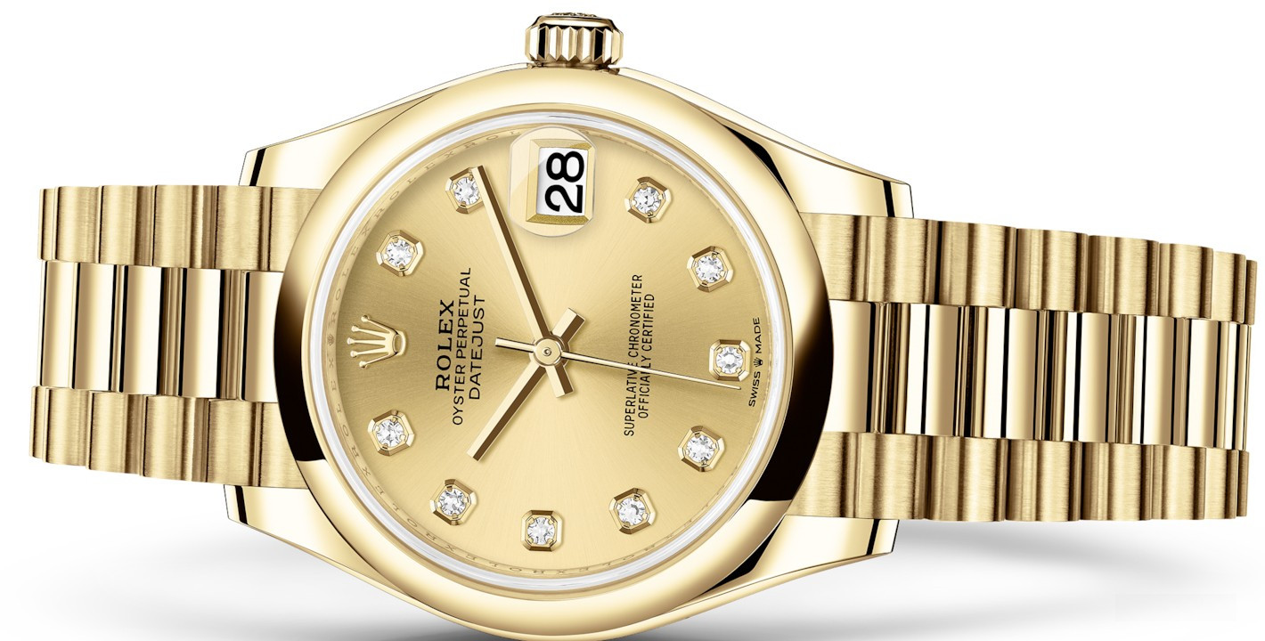 Часы Rolex Datejust Datejust 31mm Yellow Gold 278248-0014 выпущены в круглом корпусе из желтого золота 18к. Размер составляет 31 мм, водонепроницаемость 100 м. Внутри корпуса установлен автоматический механизм. На золотистом циферблате с 10-ю белыми бриллиантами отображаются часы, минуты, секунды, дата. Часы комплектуются браслетом из желтого золота 18к.