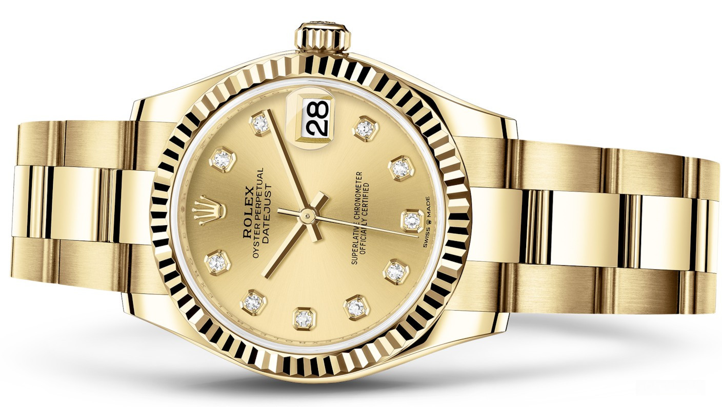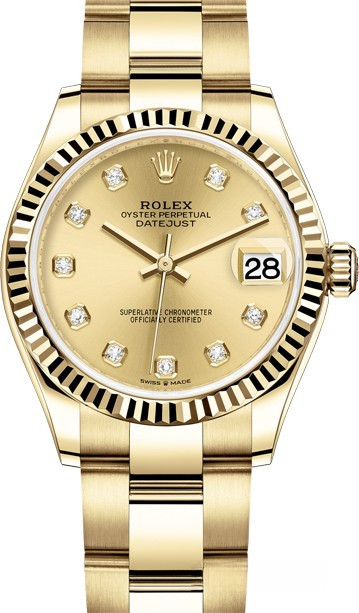 Часы Rolex Datejust Datejust 31mm Yellow Gold 278278-0016 выпущены в круглом корпусе из желтого золота 18к. Размер составляет 31 мм, водонепроницаемость 100 м. Внутри корпуса установлен автоматический механизм. На золотистом с 10-ю белыми бриллиантами циферблате отображаются часы, минуты, секунды, дата. Часы комплектуются браслетом из желтого золота 18к.