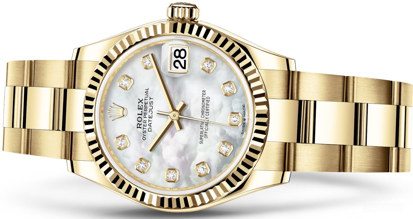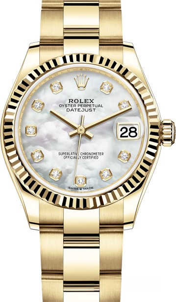 Часы Rolex Datejust Datejust 31mm Yellow Gold 278278-0017 выпущены в круглом корпусе из желтого золота 18к. Размер составляет 31 мм, водонепроницаемость 100 м. Внутри корпуса установлен автоматический механизм. На белом жемчужном с 10-ю белыми бриллиантами циферблате отображаются часы, минуты, секунды, дата. Часы комплектуются браслетом из желтого золота 18к.