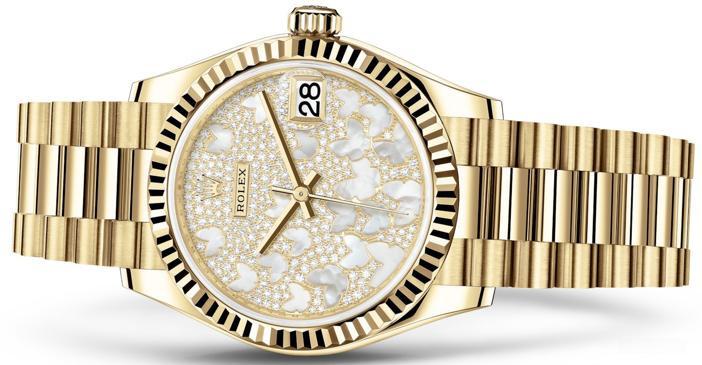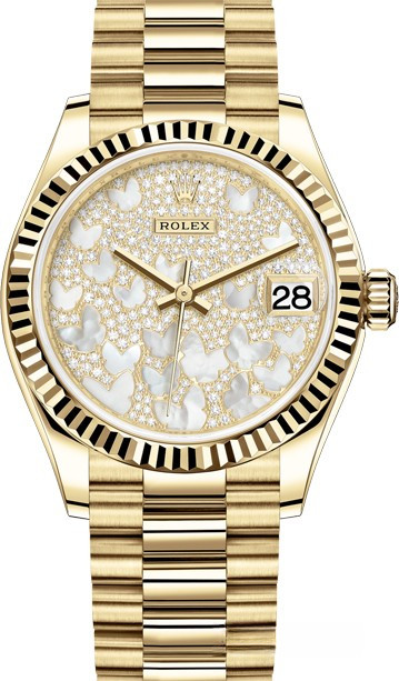 Часы Rolex Datejust Datejust 31mm Yellow Gold 278278-0022 выпущены в круглом корпусе из желтого золота 18к. Размер составляет 31 мм, водонепроницаемость 100 м. Внутри корпуса установлен автоматический механизм. На золотистом с белым жемчужным и белыми бриллиантами циферблате отображаются часы, минуты, секунды, дата. Часы комплектуются браслетом из желтого золота 18к.