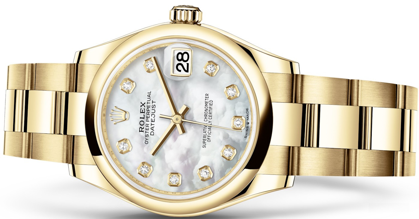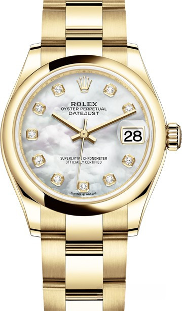 Часы Rolex Datejust Datejust 31mm Yellow Gold 278248-0015 выпущены в круглом корпусе из желтого золота 18к. Размер составляет 31 мм, водонепроницаемость 100 м. Внутри корпуса установлен автоматический механизм. На белом жемчужном циферблате с 10-ю белыми бриллиантами отображаются часы, минуты, секунды, дата. Часы комплектуются браслетом из желтого золота 18к.