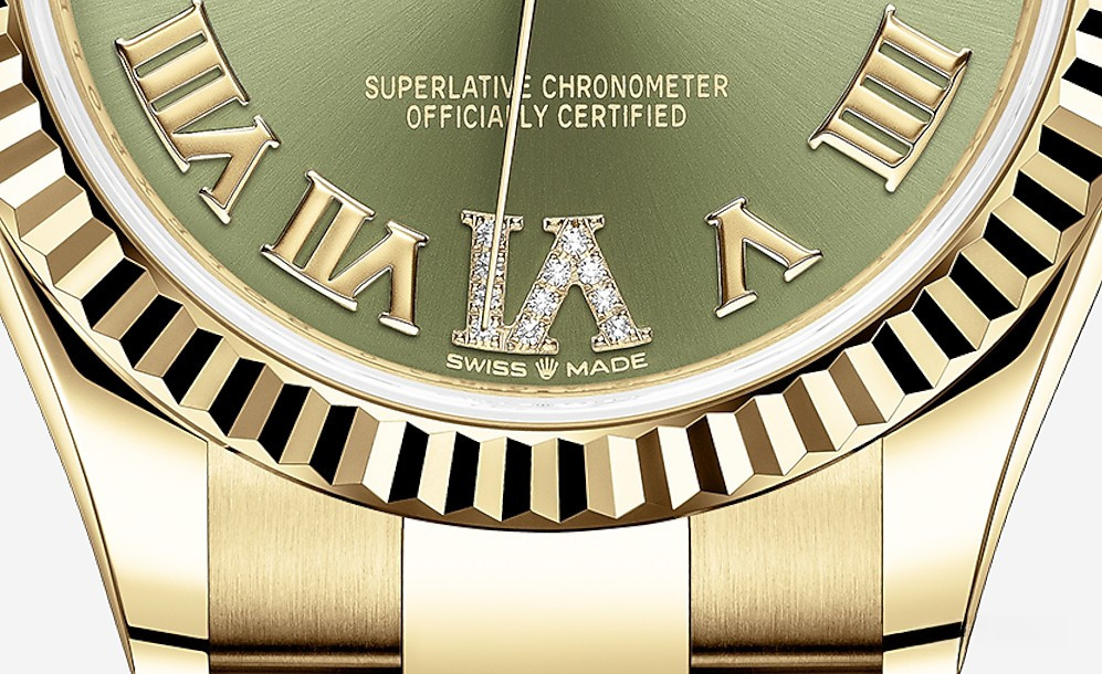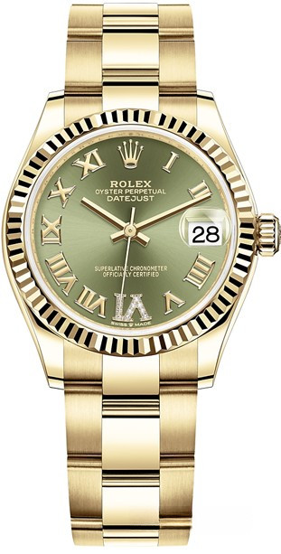 Часы Rolex Datejust Datejust 31mm Yellow Gold выпущены в круглом корпусе из желтого золота 18к. Размер составляет 31 мм, водонепроницаемость 100 м. Внутри корпуса установлен автоматический механизм. На зеленом циферблате с белыми бриллиантами отображаются часы, минуты, секунды, дата. Часы комплектуются браслетом из желтого золота 18к.
