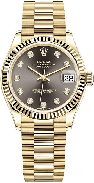 Часы Rolex Datejust Datejust 31mm Yellow Gold выпущены в круглом корпусе из желтого золота 18к. Размер составляет 31 мм, водонепроницаемость 100 м. Внутри корпуса установлен автоматический механизм. На сером циферблате с 10-ю белыми бриллиантами отображаются часы, минуты, секунды, дата. Часы комплектуются браслетом из желтого золота 18к.