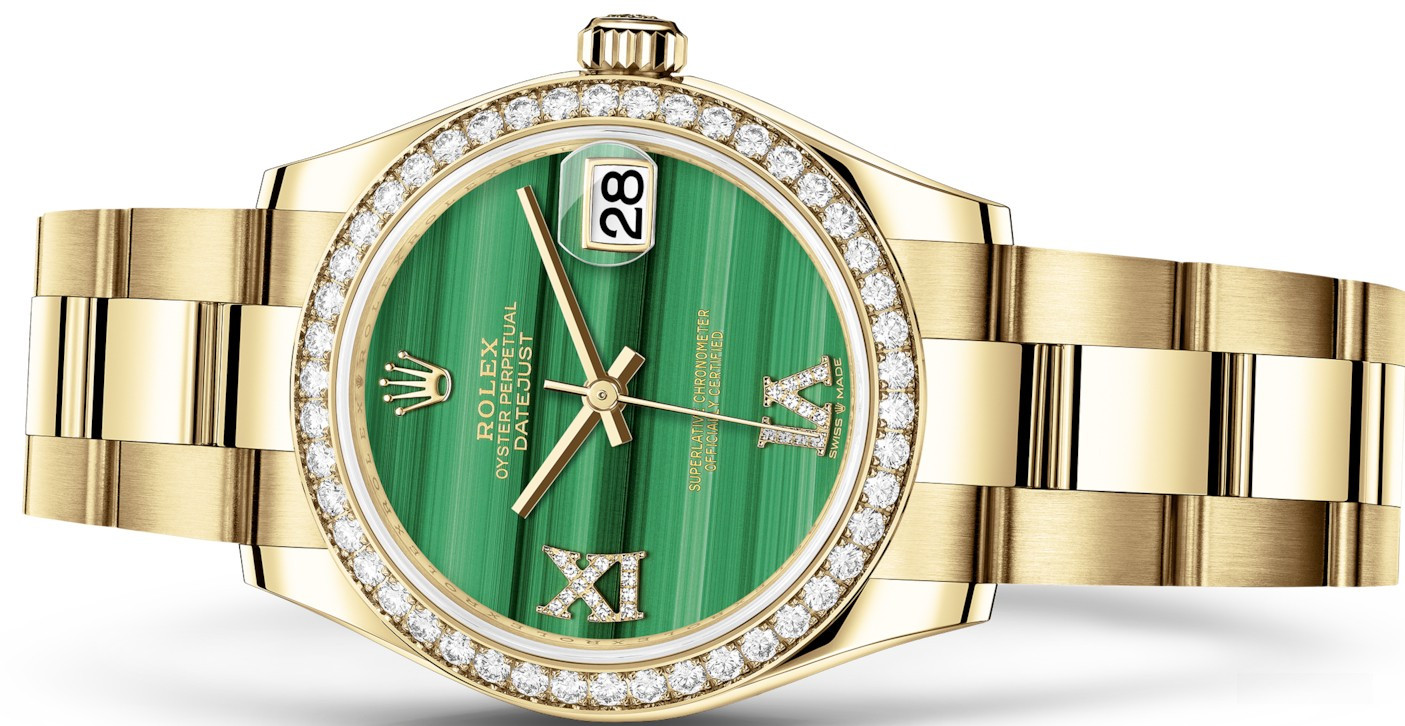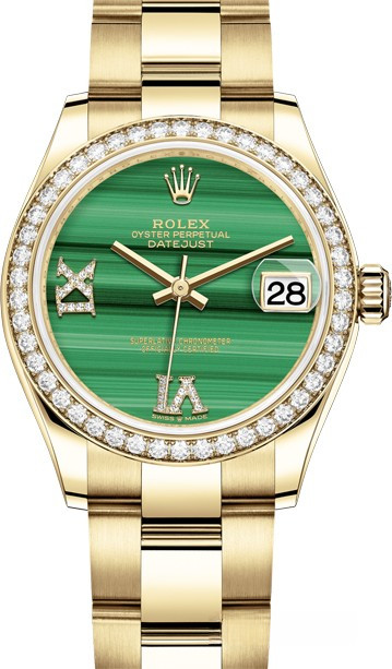 Часы Rolex Datejust Datejust 31mm Yellow Gold 278288rbr-0003 выпущены в круглом корпусе из желтого золота 18к. Размер составляет 31 мм, водонепроницаемость 100 м. Внутри корпуса установлен автоматический механизм. На зеленом малахитовом циферблате с белыми бриллиантами отображаются часы, минуты, секунды, дата. Часы комплектуются браслетом из желтого золота 18к. Безель из белых бриллиантов.