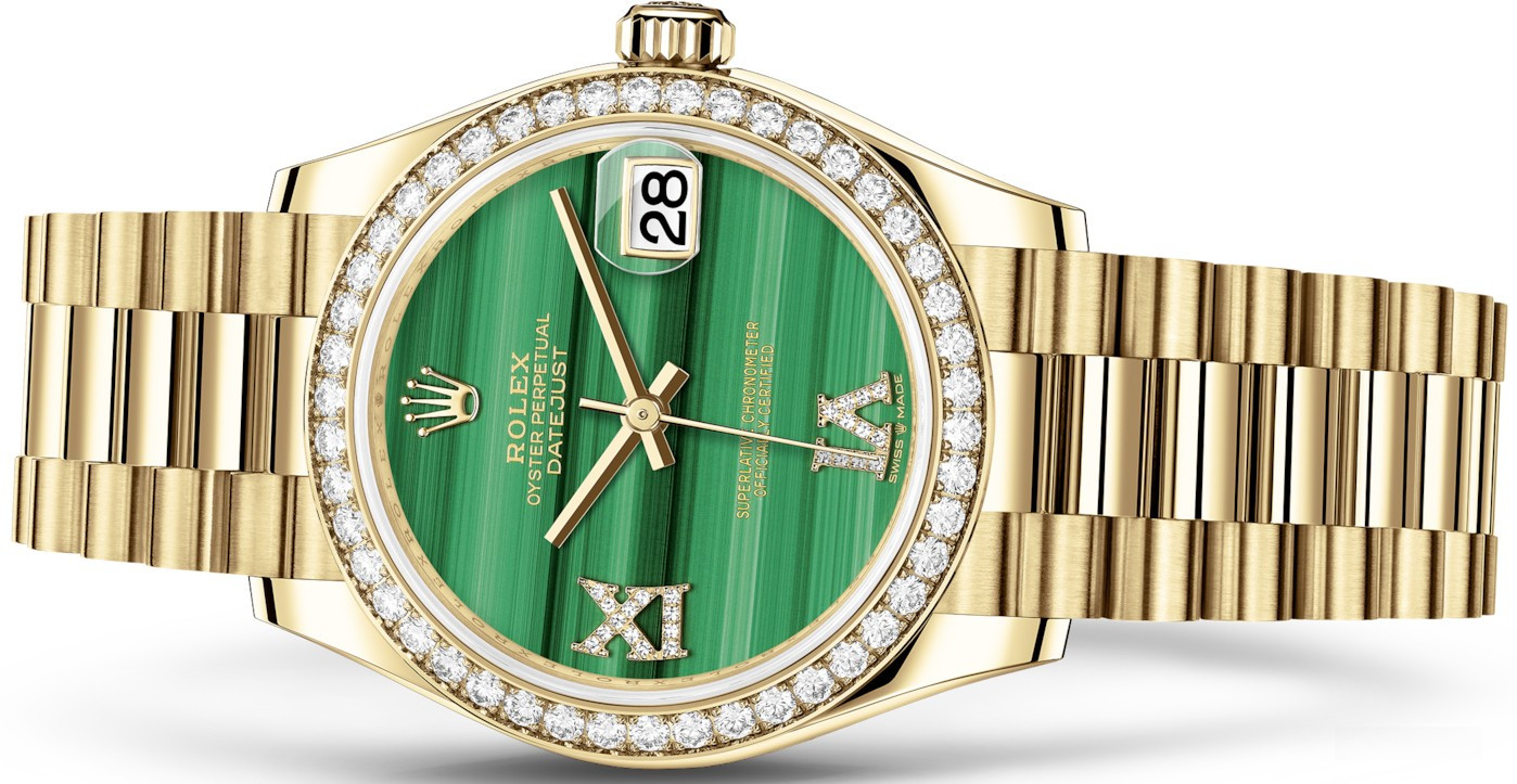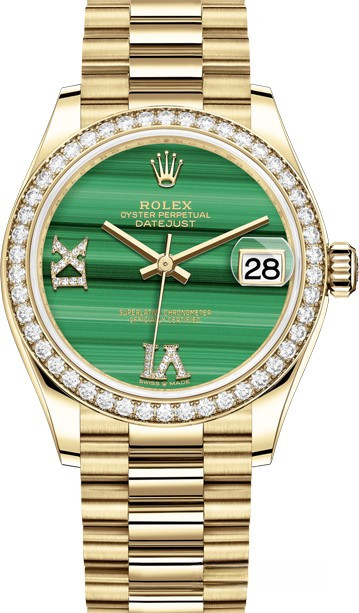 Часы Rolex Datejust Datejust 31mm Yellow Gold 278288rbr-0004 выпущены в круглом корпусе из желтого золота 18к. Размер составляет 31 мм, водонепроницаемость 100 м. Внутри корпуса установлен автоматический механизм. На циферблате из зеленого малахита с белыми бриллиантами отображаются часы, минуты, секунды, дата. Часы комплектуются браслетом из желтого золота 18к и откидной застежкой. Безель из белых бриллиантов.