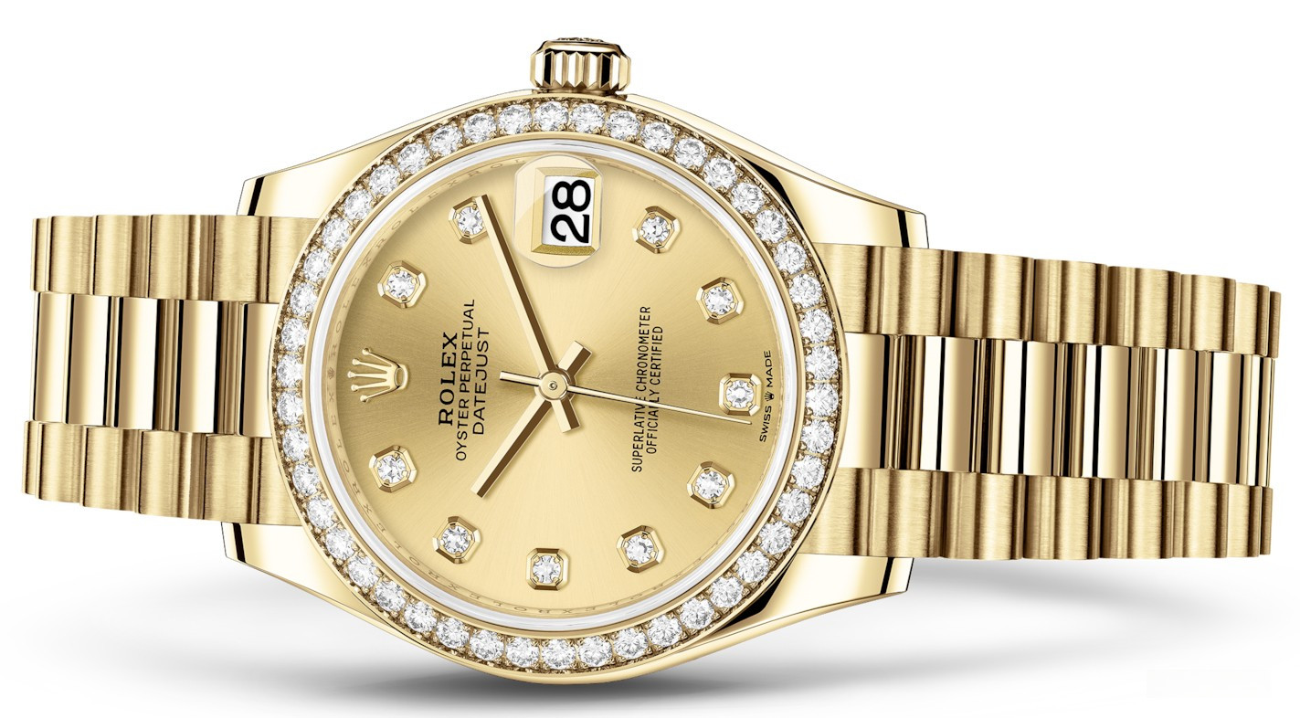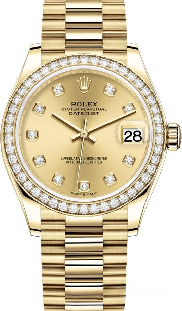 Часы Rolex Datejust Datejust 31mm Yellow Gold 278288rbr-0005 выпущены в круглом корпусе из желтого золота 18к. Размер составляет 31 мм, водонепроницаемость 100 м. Внутри корпуса установлен автоматический механизм. На золотистом циферблате с 10-ю белыми бриллиантами отображаются часы, минуты, секунды, дата. Часы комплектуются браслетом из желтого золота 18к. Безель из белых бриллиантов.