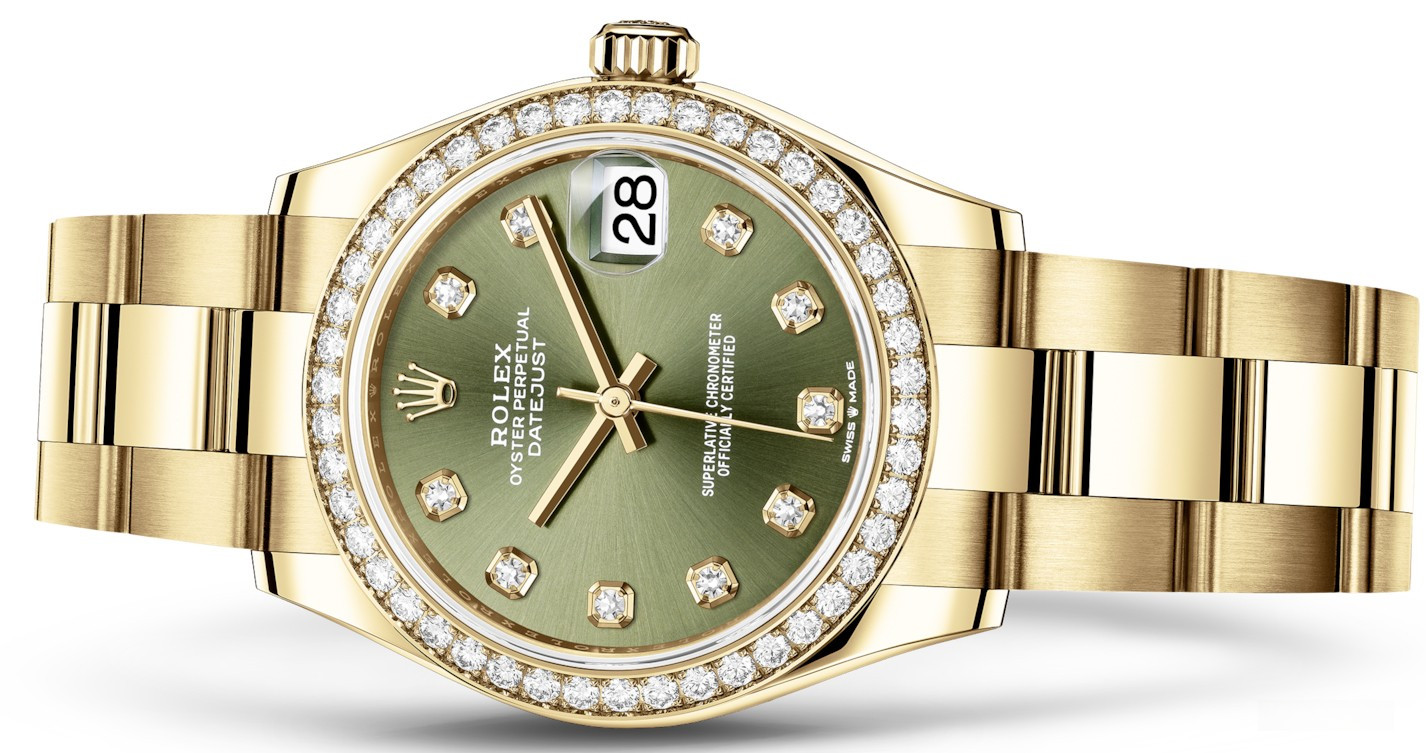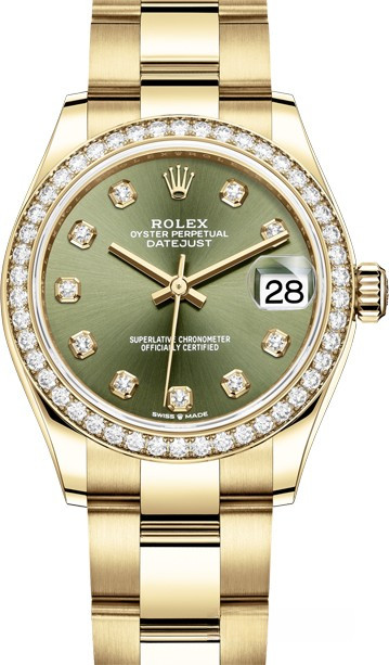 Часы Rolex Datejust Datejust 31mm Yellow Gold 278288rbr-0014 выпущены в круглом корпусе из желтого золота 18к. Размер составляет 31 мм, водонепроницаемость 100 м. Внутри корпуса установлен автоматический механизм. На зеленом с 10-ю белыми бриллиантами циферблате отображаются часы, минуты, секунды, дата. Часы комплектуются браслетом из желтого золота 18к. Безель из белых бриллиантов.