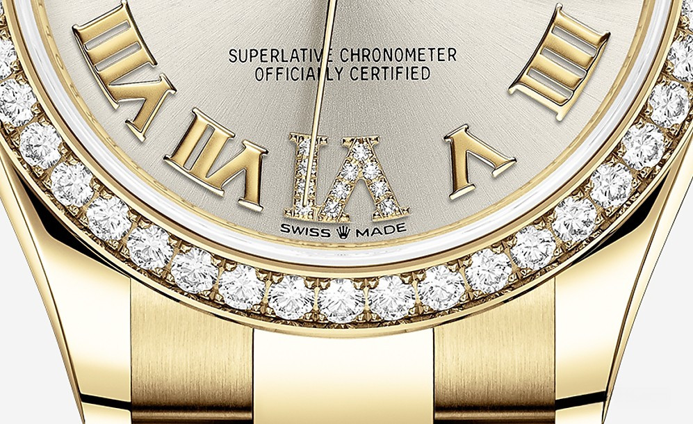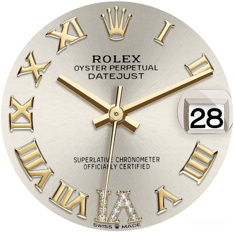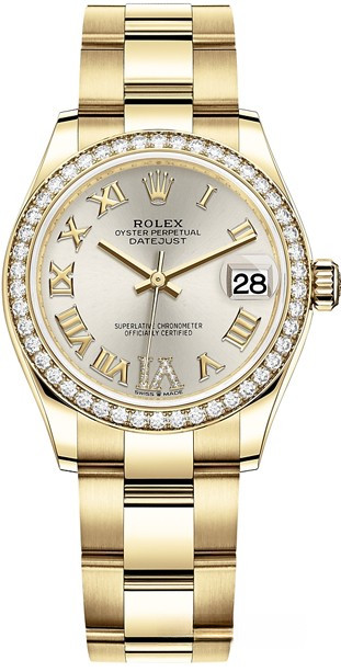 Часы Rolex Datejust Datejust 31mm Yellow Gold выпущены в круглом корпусе из желтого золота 18к. Размер составляет 31 мм, водонепроницаемость 100 м. Внутри корпуса установлен автоматический механизм. На серебристом циферблате с белыми бриллиантами отображаются часы, минуты, секунды, дата. Часы комплектуются браслетом из желтого золота 18к. Безель из белых бриллиантов.