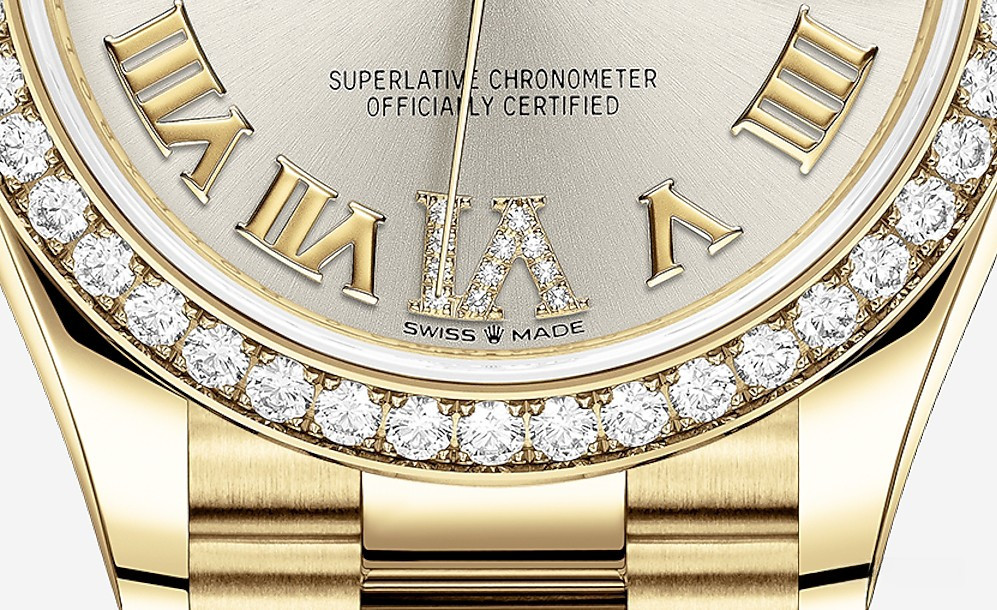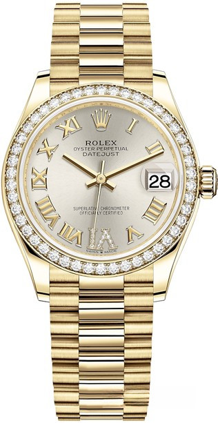 Часы Rolex Datejust Datejust 31mm Yellow Gold выпущены в круглом корпусе из желтого золота 18к. Размер составляет 31 мм, водонепроницаемость 100 м. Внутри корпуса установлен автоматический механизм. На серебристом циферблате с белыми бриллиантами отображаются часы, минуты, секунды, дата. Часы комплектуются браслетом из желтого золота 18к. Безель из белых бриллиантов.