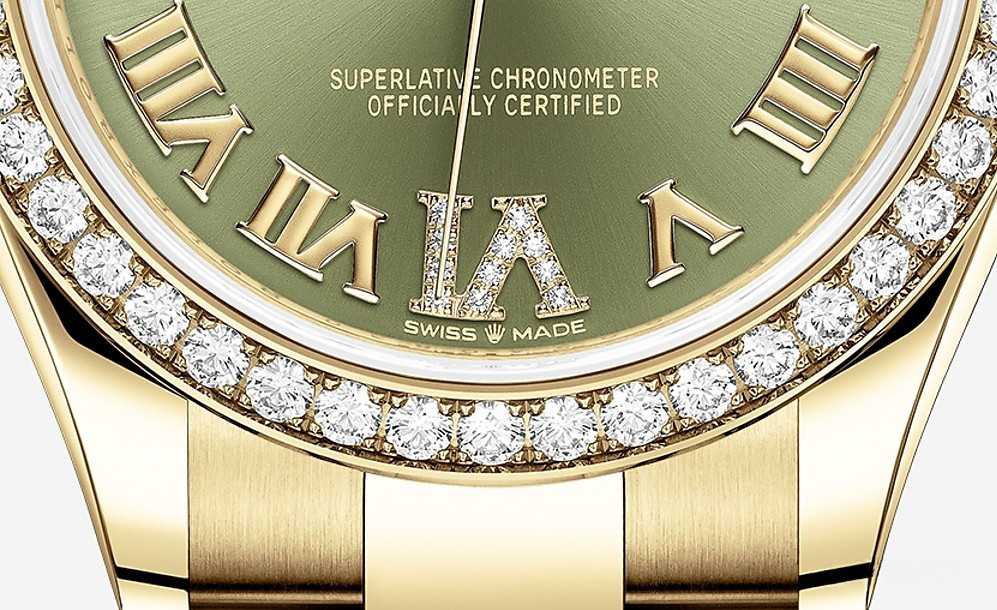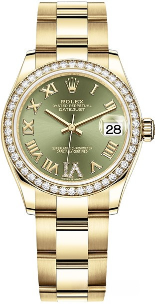 Часы Rolex Datejust Datejust 31mm Yellow Gold выпущены в круглом корпусе из желтого золота 18к. Размер составляет 31 мм, водонепроницаемость 100 м. Внутри корпуса установлен автоматический механизм. На зеленом циферблате с белыми бриллиантами отображаются часы, минуты, секунды, дата. Часы комплектуются браслетом из желтого золота 18к. Безель из белых бриллиантов.