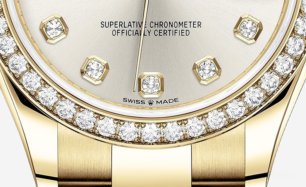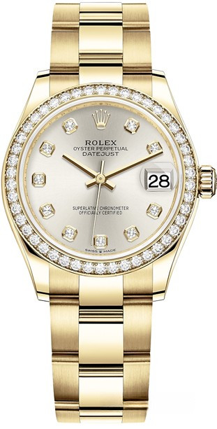 Часы Rolex Datejust Datejust 31mm Yellow Gold выпущены в круглом корпусе из желтого золота 18к. Размер составляет 31 мм, водонепроницаемость 100 м. Внутри корпуса установлен автоматический механизм. На серебристом циферблате с 10-ю белыми бриллиантами отображаются часы, минуты, секунды, дата. Часы комплектуются браслетом из желтого золота 18к. Безель из белых бриллиантов.