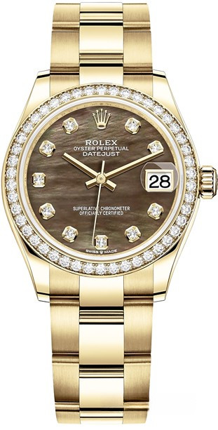Часы Rolex Datejust Datejust 31mm Yellow Gold выпущены в круглом корпусе из желтого золота 18к. Размер составляет 31 мм, водонепроницаемость 100 м. Внутри корпуса установлен автоматический механизм. На черном жемчужном циферблате с 10-ю белыми бриллиантами отображаются часы, минуты, секунды, дата. Часы комплектуются браслетом из желтого золота 18к. Безель из белых бриллиантов.