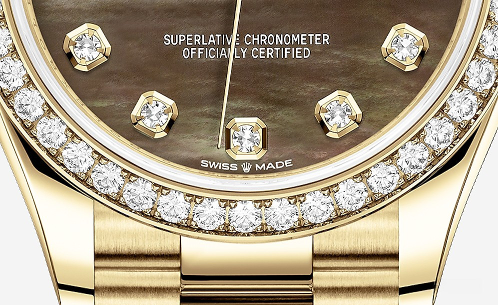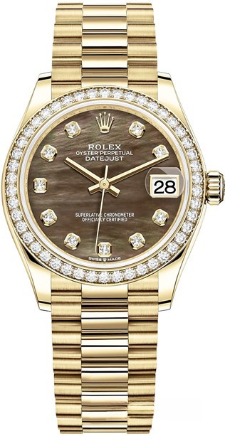 Часы Rolex Datejust Datejust 31mm Yellow Gold выпущены в круглом корпусе из желтого золота 18к. Размер составляет 31 мм, водонепроницаемость 100 м. Внутри корпуса установлен автоматический механизм. На черном жемчужном циферблате с 10-ю белыми бриллиантами отображаются часы, минуты, секунды, дата. Часы комплектуются браслетом из желтого золота 18к. Безель из белых бриллиантов.