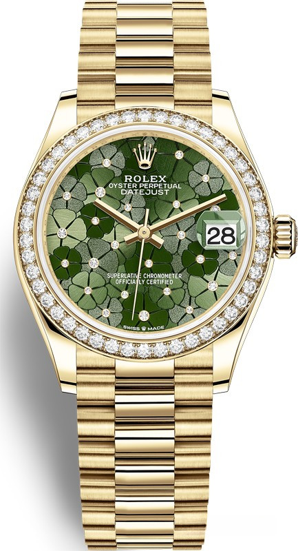 Часы Rolex Datejust Datejust 31mm Yellow Gold выпущены в круглом корпусе из желтого золота 18к. Размер составляет 31 мм, водонепроницаемость 100 м. Внутри корпуса установлен автоматический механизм. На зеленом циферблате с белыми бриллиантами отображаются часы, минуты, секунды, дата. Часы комплектуются браслетом из желтого золота 18к. Безель из белых бриллиантов.