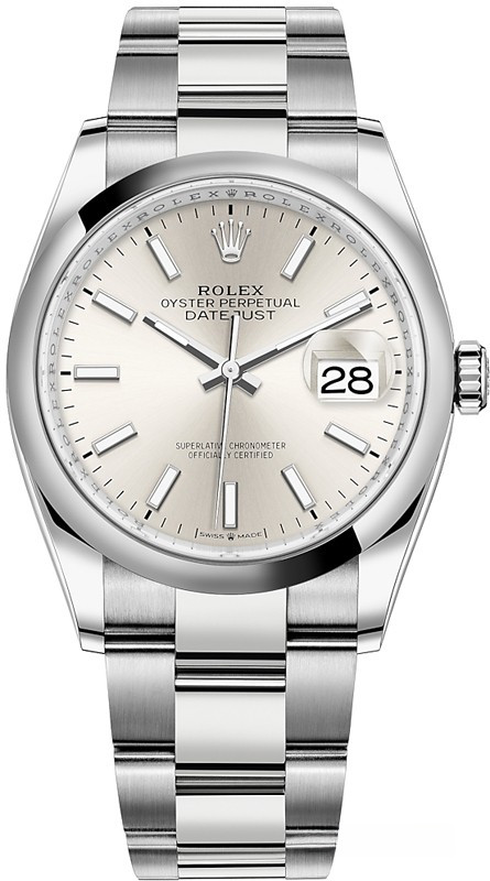 Водостойкие часы Rolex Datejust Datejust 36mm Steel являются официально сертифицированным хронометром COSC, выпущены в круглом корпусе из нержавеющей стали. Размер составляет 36 мм, водонепроницаемость 100 м. Внутри корпуса установлен автоматический механизм, обеспечивающий запас хода 48 часов. На серебристом циферблате отображаются часы, минуты, секунды, дата. Часы комплектуются браслетом из нержавеющей стали с откидной застежкой.