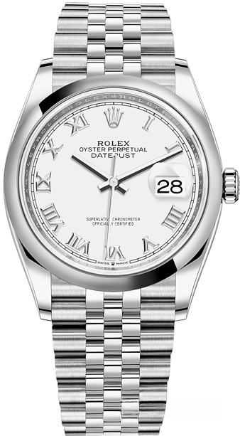 Водостойкие часы Rolex Datejust Datejust 36mm Steel являются официально сертифицированным хронометром COSC, выпущены в круглом корпусе из нержавеющей стали. Размер составляет 36 мм, водонепроницаемость 100 м. Внутри корпуса установлен автоматический механизм, обеспечивающий запас хода 48 часов. На белом циферблате отображаются часы, минуты, секунды, дата. Часы комплектуются браслетом из нержавеющей стали с откидной застежкой.