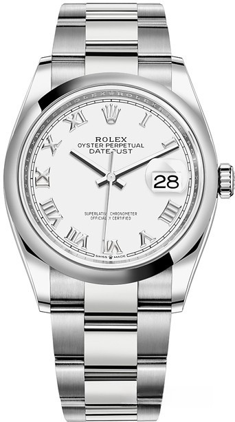 Водостойкие часы Rolex Datejust Datejust 36mm Steel являются официально сертифицированным хронометром COSC, выпущены в круглом корпусе из нержавеющей стали. Размер составляет 36 мм, водонепроницаемость 100 м. Внутри корпуса установлен автоматический механизм, обеспечивающий запас хода 48 часов. На белом циферблате отображаются часы, минуты, секунды, дата. Часы комплектуются браслетом из нержавеющей стали с откидной застежкой.