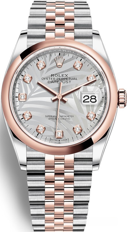 Часы Rolex Datejust 36 mm изготовлены из нержавеющей стали и розового золота 18к размером 36 х 11 мм. Внутри корпуса установлен автоматический механизм, Калибр 3235 с запасом хода 70 часов. Механизм имеет сертификат швейцарского хронометра, выдаваемый сверхточным часам, успешно прошедшим тестирование в Официальном швейцарском институте хронометрии (COSC). Браслет из розового золота и нержавеющей стали. Циферблат серебристый, с 10-ю белыми бриллиантами. Водонепроницаемость до 100 метров.