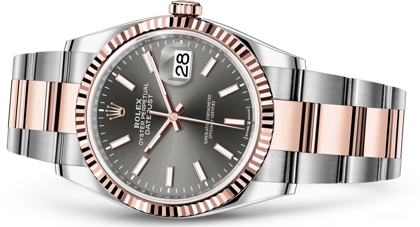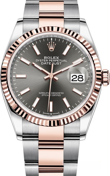 Часы Rolex 126231-0014 изготовлены из нержавеющей стали и розового золота 18к размером 36 х 11 мм. Внутри корпуса установлен автоматический механизм, Калибр 3235 с запасом хода 70 часов. Механизм имеет сертификат швейцарского хронометра, выдаваемый сверхточным часам, успешно прошедшим тестирование в Официальном швейцарском институте хронометрии (COSC). Браслет из розового золота и нержавеющей стали. Циферблат серый. Водонепроницаемость до 100 метров.