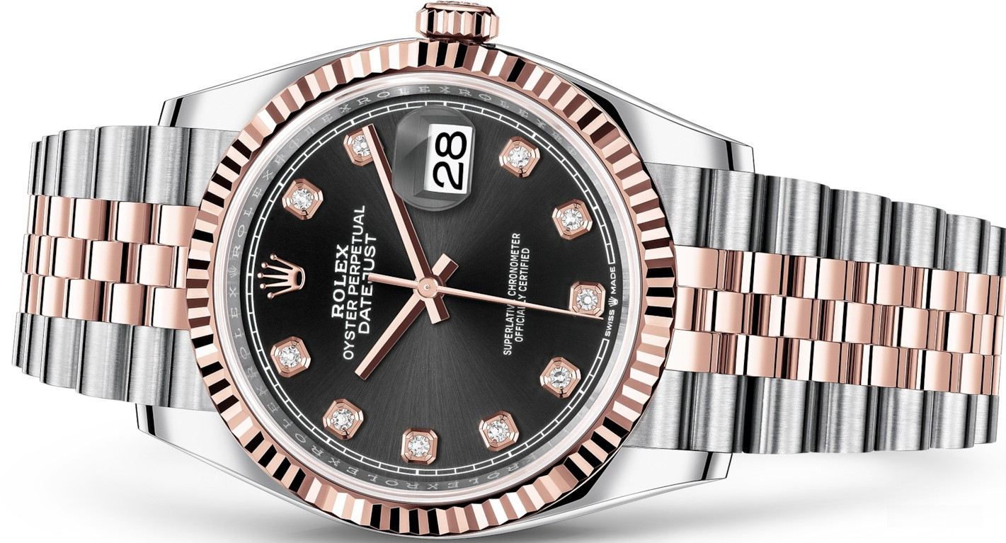 Часы Rolex 126231-0019 изготовлены из нержавеющей стали и розового золота 18к размером 36 х 11 мм. Внутри корпуса установлен автоматический механизм, Калибр 3235 с запасом хода 70 часов. Механизм имеет сертификат швейцарского хронометра, выдаваемый сверхточным часам, успешно прошедшим тестирование в Официальном швейцарском институте хронометрии (COSC). Браслет из розового золота и нержавеющей стали. Циферблат черный с 10-ю белыми бриллиантами. Водонепроницаемость до 100 метров.