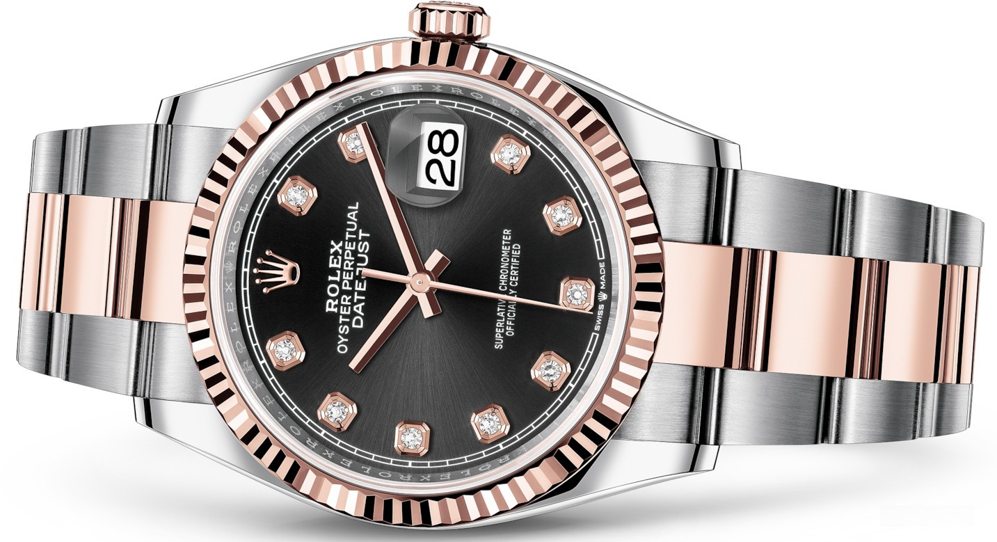 Часы Rolex 126231-0020 изготовлены из нержавеющей стали и розового золота 18к размером 36 х 11 мм. Внутри корпуса установлен автоматический механизм, Калибр 3235 с запасом хода 70 часов. Механизм имеет сертификат швейцарского хронометра, выдаваемый сверхточным часам, успешно прошедшим тестирование в Официальном швейцарском институте хронометрии (COSC). Браслет из розового золота и нержавеющей стали. Циферблат черный с 10-ю белыми бриллиантами. Водонепроницаемость до 100 метров.
