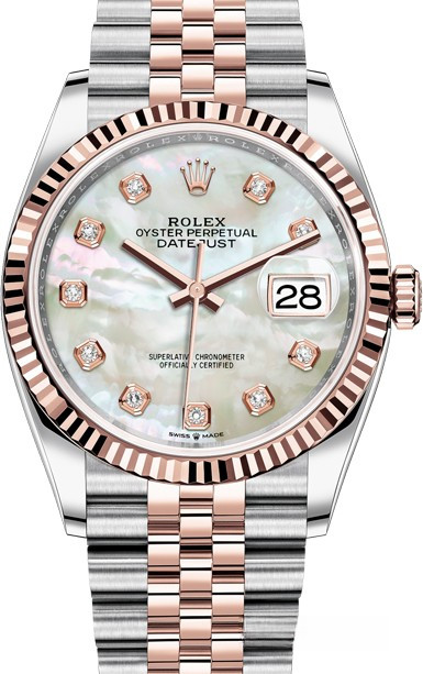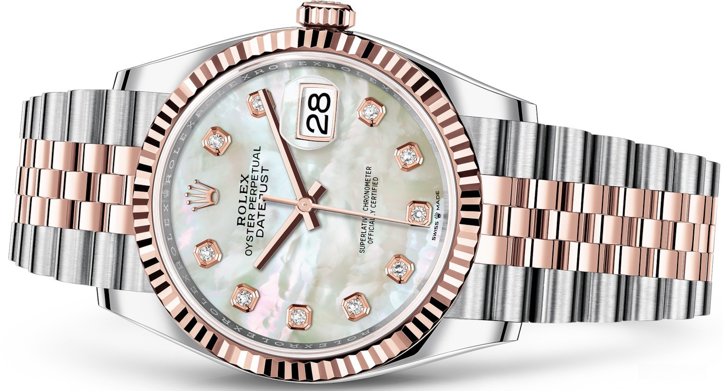 Часы Rolex 126231-0021 изготовлены из нержавеющей стали и розового золота 18к размером 36 х 11 мм. Внутри корпуса установлен автоматический механизм, Калибр 3235 с запасом хода 70 часов. Механизм имеет сертификат швейцарского хронометра, выдаваемый сверхточным часам, успешно прошедшим тестирование в Официальном швейцарском институте хронометрии (COSC). Браслет из розового золота и нержавеющей стали. Циферблат белый жемчужный с 10-ю белыми бриллиантами. Водонепроницаемость до 100 метров.