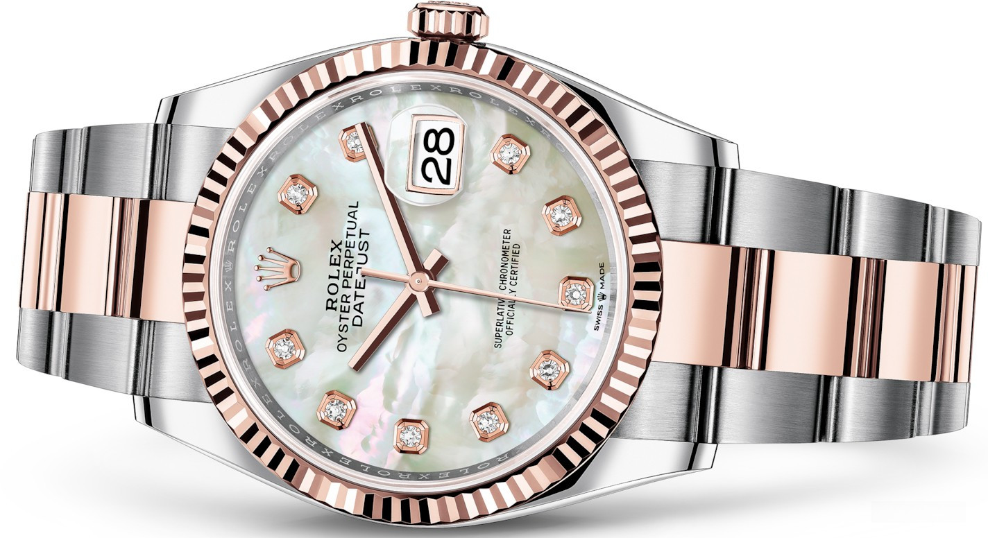 Часы Rolex 126231-0022 изготовлены из нержавеющей стали и розового золота 18к размером 36 х 11 мм. Внутри корпуса установлен автоматический механизм, Калибр 3235 с запасом хода 70 часов. Механизм имеет сертификат швейцарского хронометра, выдаваемый сверхточным часам, успешно прошедшим тестирование в Официальном швейцарском институте хронометрии (COSC). Браслет из розового золота и нержавеющей стали. Циферблат белый жемчужный с 10-ю белыми бриллиантами. Водонепроницаемость до 100 метров.