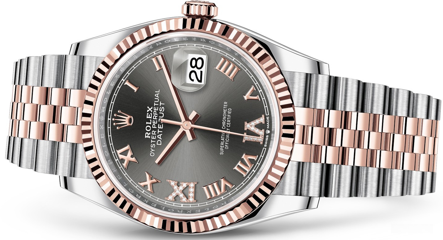 Часы Rolex 126231-0023 изготовлены из нержавеющей стали и розового золота 18к размером 36 х 11 мм. Внутри корпуса установлен автоматический механизм, Калибр 3235 с запасом хода 70 часов. Механизм имеет сертификат швейцарского хронометра, выдаваемый сверхточным часам, успешно прошедшим тестирование в Официальном швейцарском институте хронометрии (COSC). Браслет из розового золота и нержавеющей стали. Циферблат серый с белыми бриллиантами. Водонепроницаемость до 100 метров.