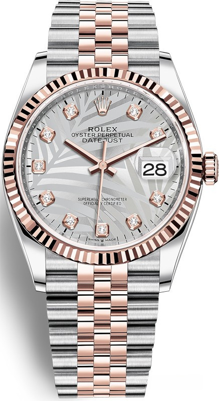 Часы Rolex Datejust 36 mm изготовлены из нержавеющей стали и розового золота 18к размером 36 х 11 мм. Внутри корпуса установлен автоматический механизм, Калибр 3235 с запасом хода 70 часов. Механизм имеет сертификат швейцарского хронометра, выдаваемый сверхточным часам, успешно прошедшим тестирование в Официальном швейцарском институте хронометрии (COSC). Браслет из розового золота и нержавеющей стали. Циферблат серебристый, с 10-ю белыми бриллиантами. Водонепроницаемость до 100 метров.