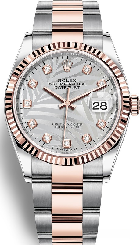 Часы Rolex Datejust 36 mm изготовлены из нержавеющей стали и розового золота 18к размером 36 х 11 мм. Внутри корпуса установлен автоматический механизм, Калибр 3235 с запасом хода 70 часов. Механизм имеет сертификат швейцарского хронометра, выдаваемый сверхточным часам, успешно прошедшим тестирование в Официальном швейцарском институте хронометрии (COSC). Браслет из розового золота и нержавеющей стали. Циферблат серебристый, с 10-ю белыми бриллиантами. Водонепроницаемость до 100 метров.