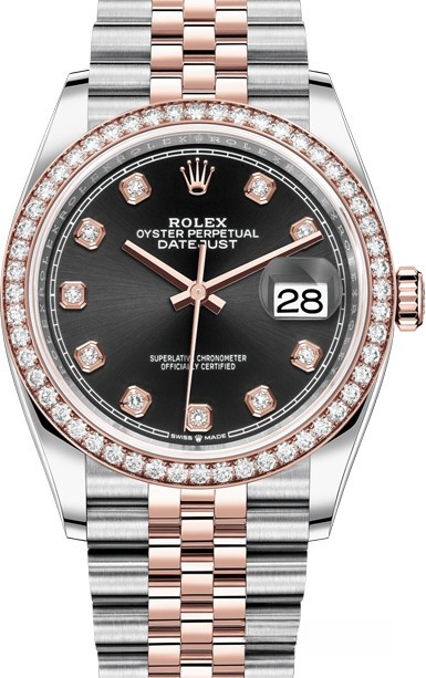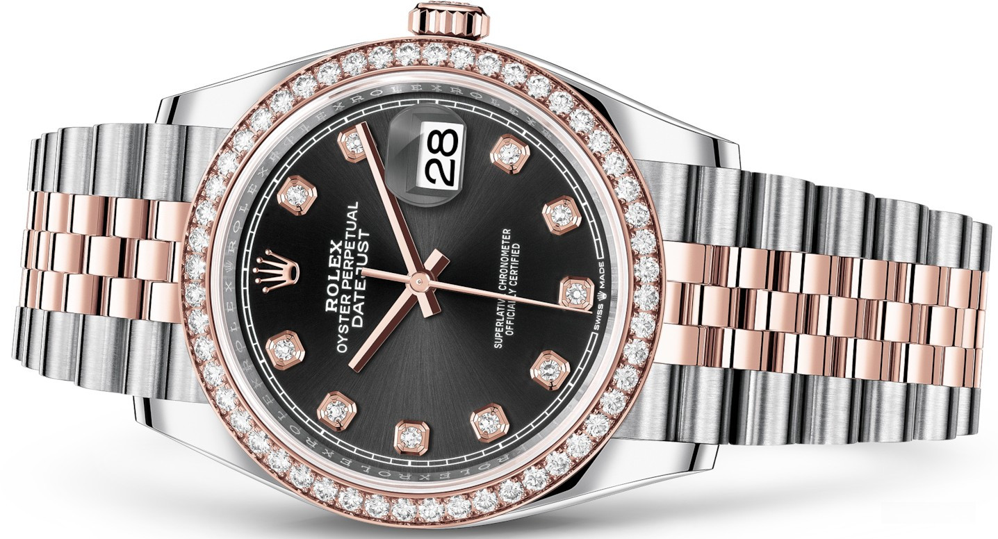 Часы Rolex 126281rbr-0007 изготовлены из нержавеющей стали и розового золота 18к размером 36 х 11 мм. Внутри корпуса установлен автоматический механизм, Калибр 3235 с запасом хода 70 часов. Механизм имеет сертификат швейцарского хронометра, выдаваемый сверхточным часам, успешно прошедшим тестирование в Официальном швейцарском институте хронометрии (COSC). Браслет из розового золота и нержавеющей стали. Циферблат черный с 10-ю белыми бриллиантами. Водонепроницаемость до 100 метров. Безель из белых бриллиантов.
